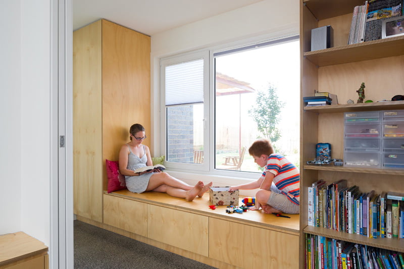 This bay window seating in a home in Canberra, Australia, designed by Jigsaw Housing. Photography by Rod Vargas.