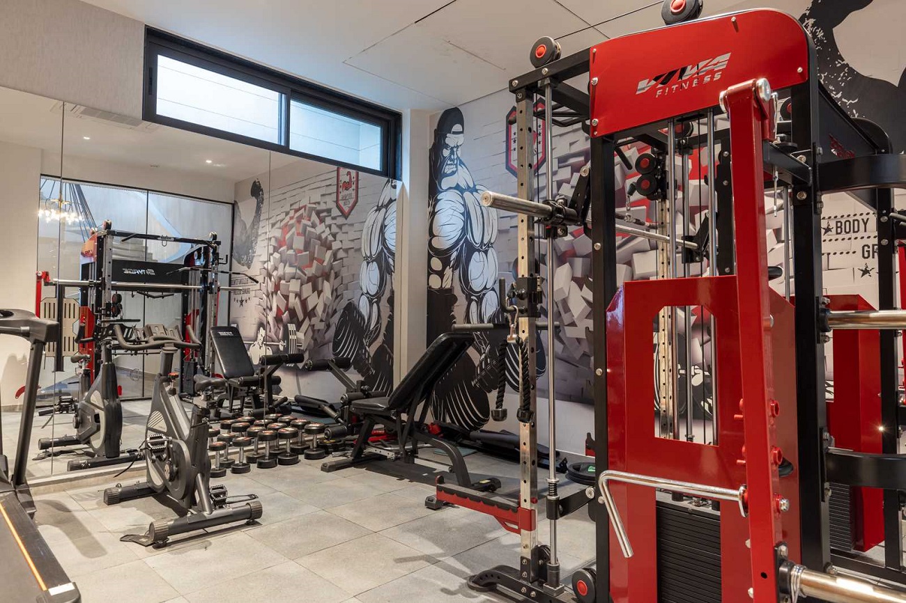 In the home gym, black and red are the chosen colors, and a large mural covers the wall.