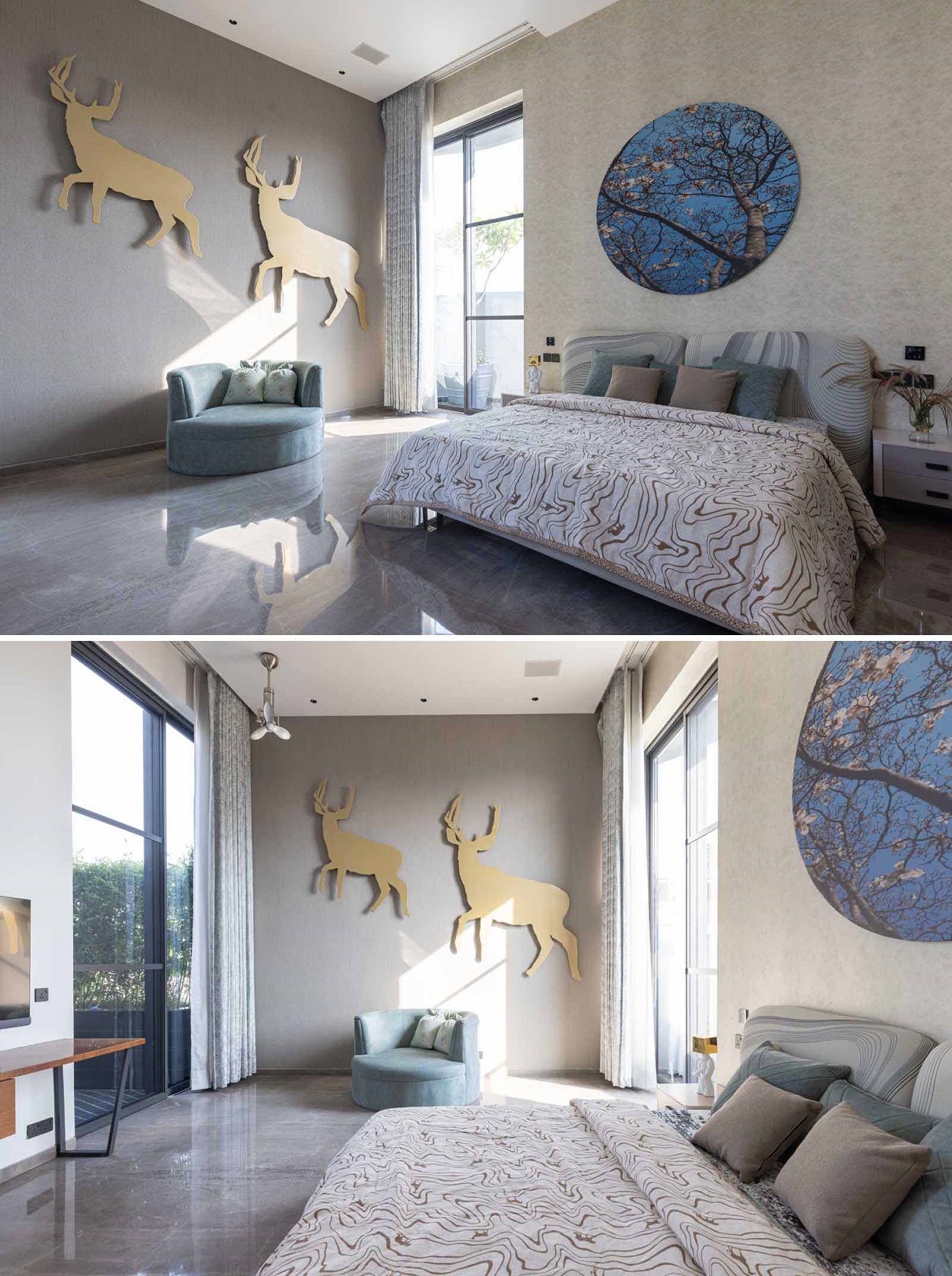 Each of the bedrooms has its own design, with details like built-in desks, large artwork, and accent walls.
