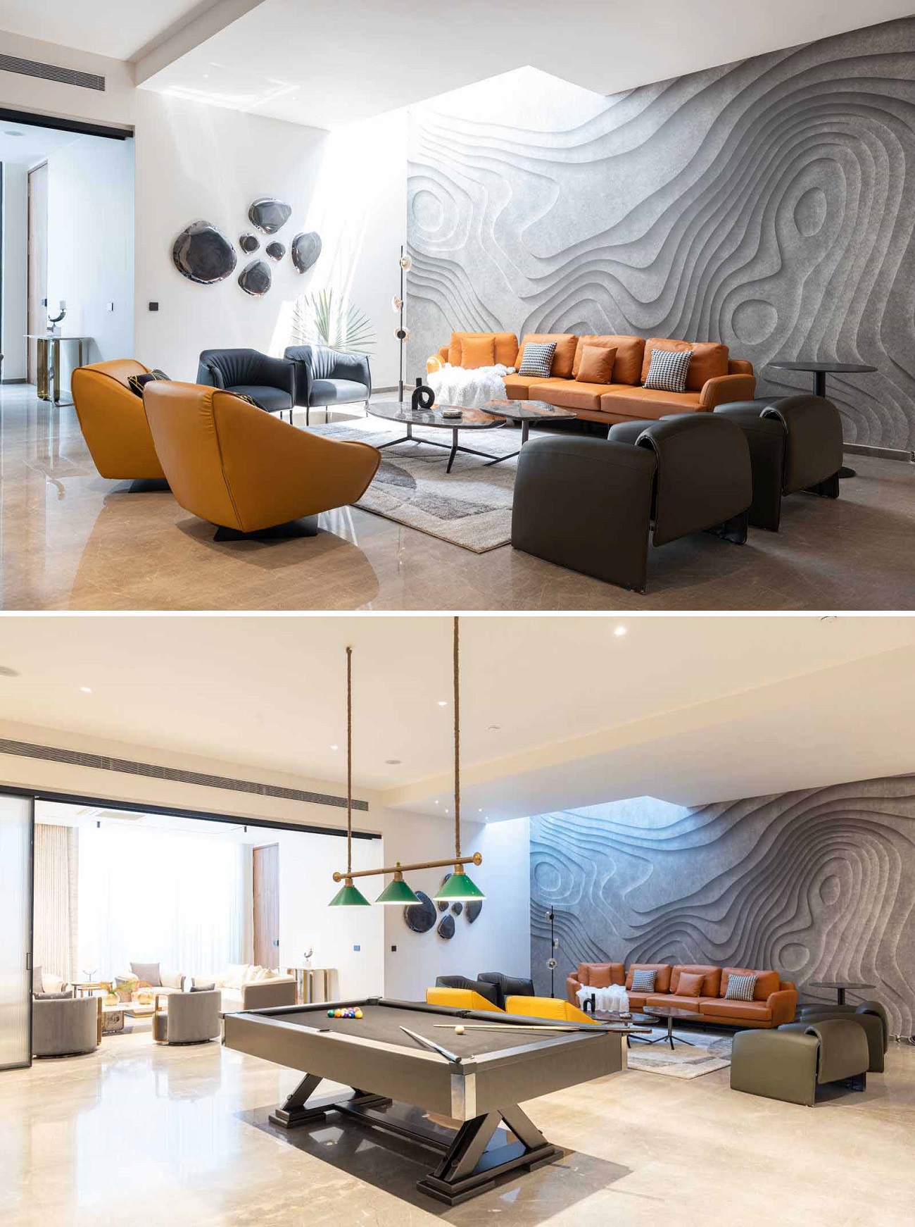 In a games room, there’s a large accent wall that provides a backdrop for the lounge area, while a pool table is centrally located in the space.