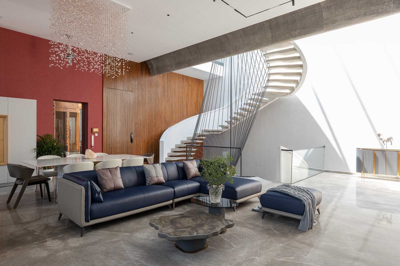 On the other side of the dining area is home to a spiral staircase with an artistic wire detail, giving the illusion of a puzzle, connecting the vertical spaces, and unfurling itself as one ascends to the upper floors. Skylight over stair well give space lighter appeal as well openness to space.