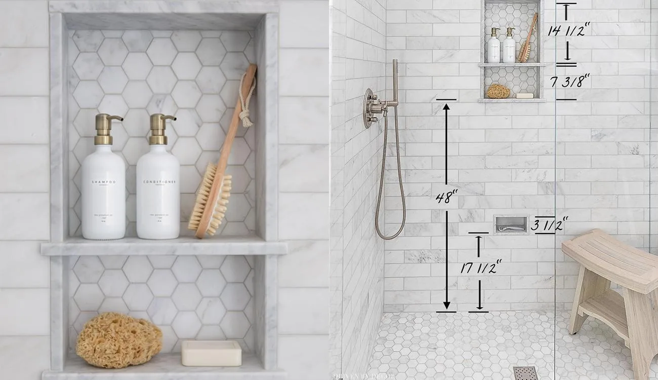 The comfort height for the shower niches is between 48” to 60”. In addition to that the knowledgeable person takes into consideration the starting and ending point of the tiles to make it look cleaner and camouflaged. The dimensioning varies based on comfort as we go more into the customization of the bathroom.