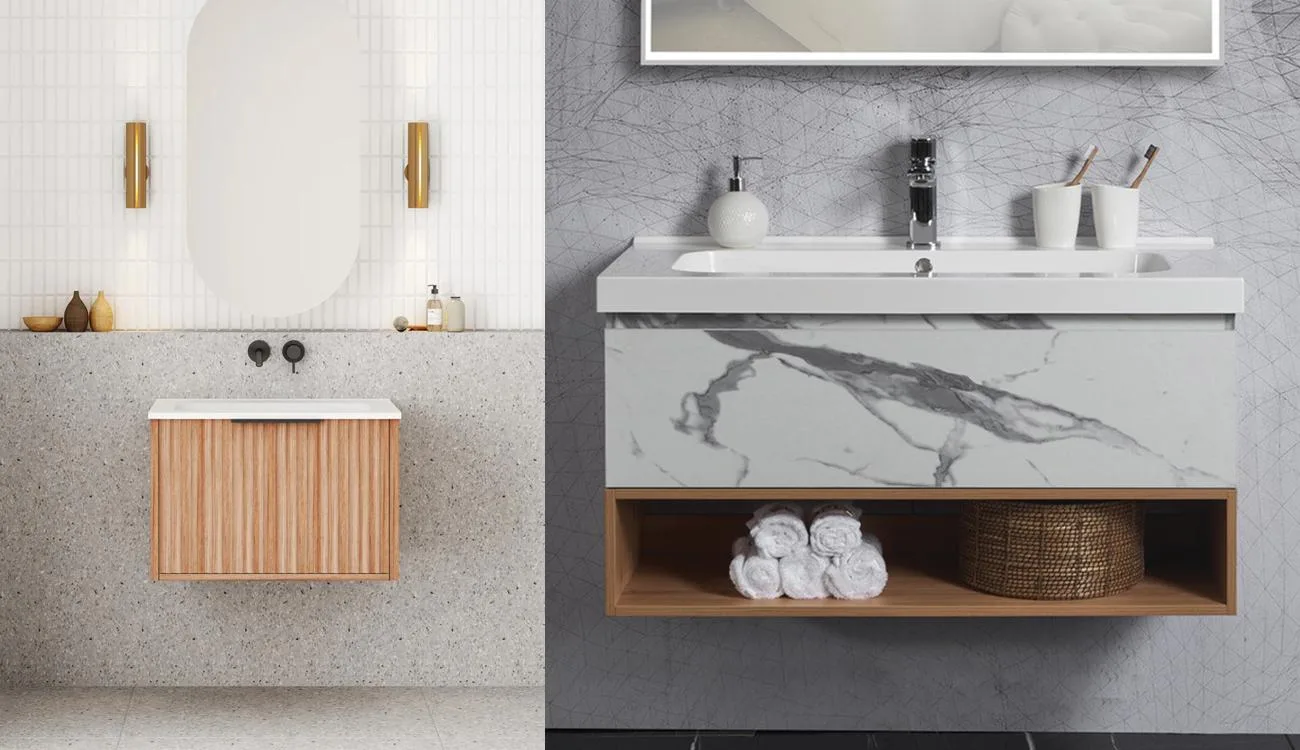 Image Source: https://designerbathware.com.au/products/capture-natural-oak-wall-hung-vanity-1, https://www.templeandwebster.com.au/Zero-1000mm-Wall-Hung-Single-Vanity-ZER-1000W-BELN1050.html#view-image