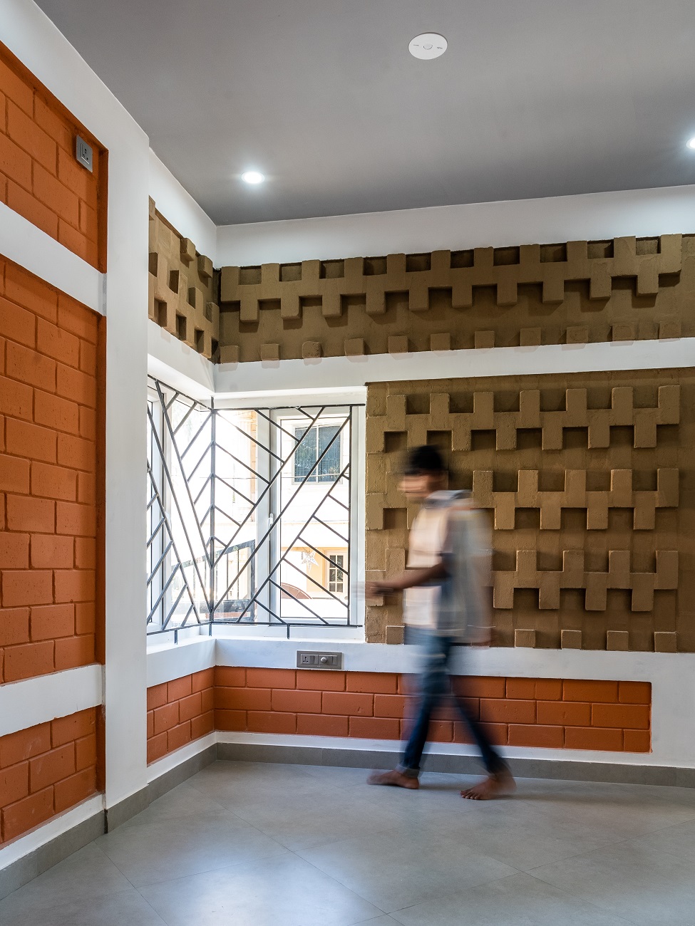 The living area faces the window in the corner creating the vista for existing trees and plantations. The house is built by having mud interlock blocks on the southern and western zone. It has case block masonry on the southernmost corner.