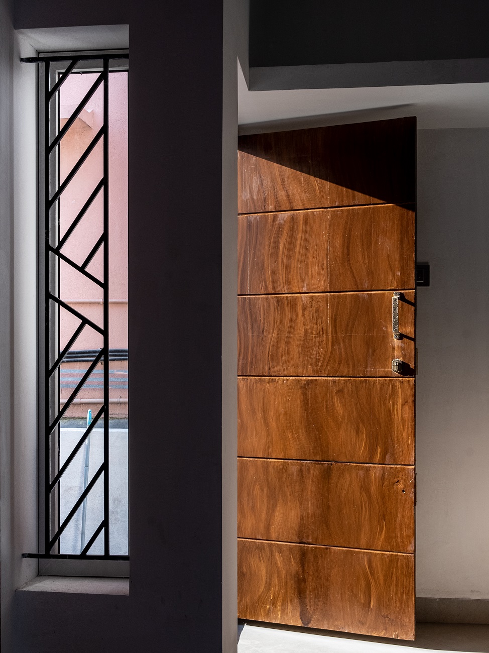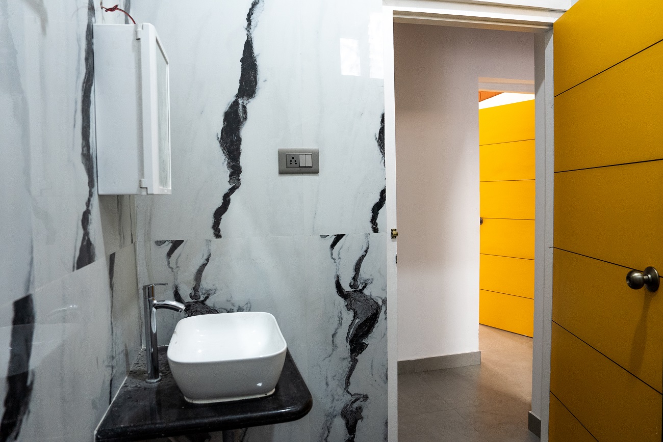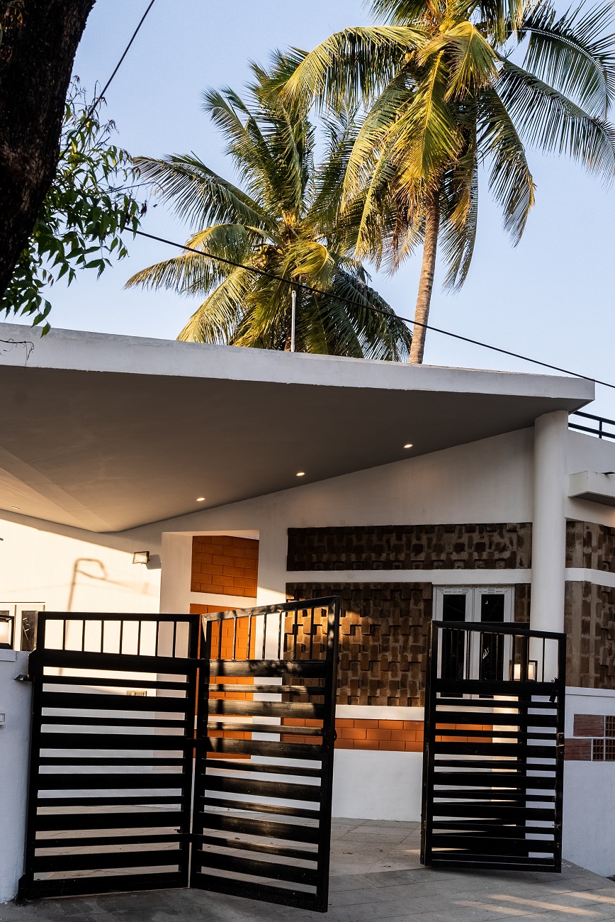 The walls are aligned in the north east to south west axis creating the wind flow without any hindrance. The entry is facing the south west direction having a small court in front of the house with the swing area and cutout on top followed by the main entrance.