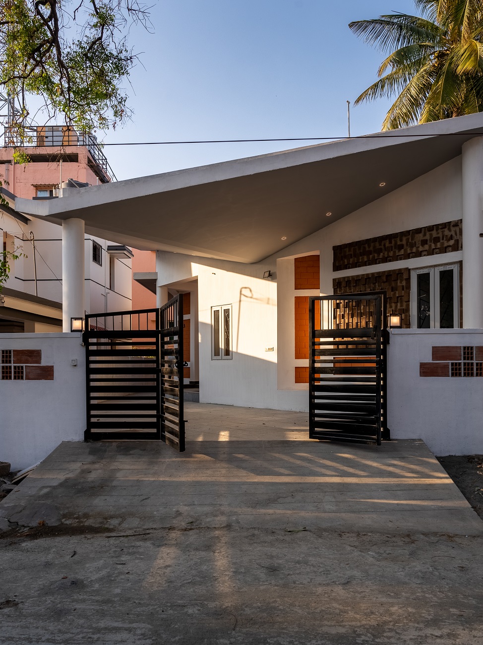 Triangular pockets are created all around the house providing the space for the landscape, Utility, pet zone and recreation. The temperature difference is around 3 degree inside the house.
