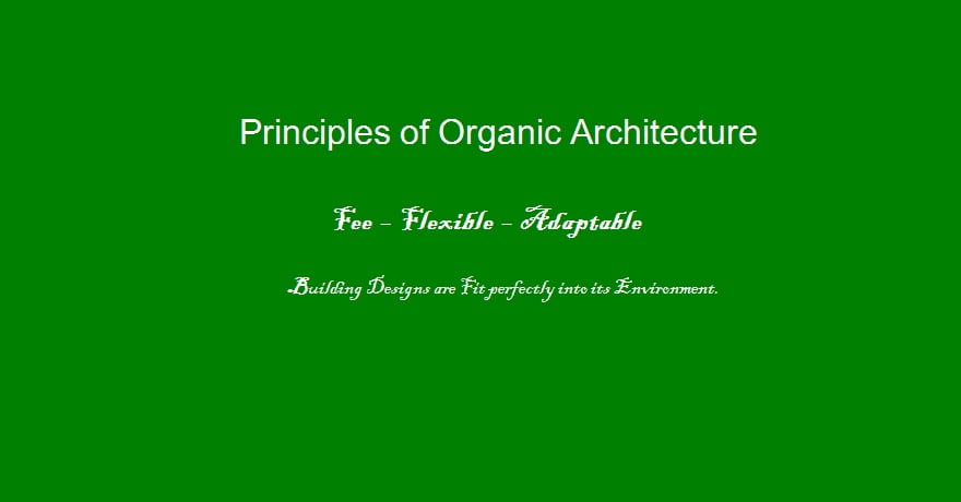 So, Main Principles of Organic architecture teach us to live with nature. We have to balance our Eco-system with our surrounding nature. That will help us to live healthy and prosperous. The organic building architecture is also divided in mainly sustainable architecture and green building designs. We will see it in depth some other time.