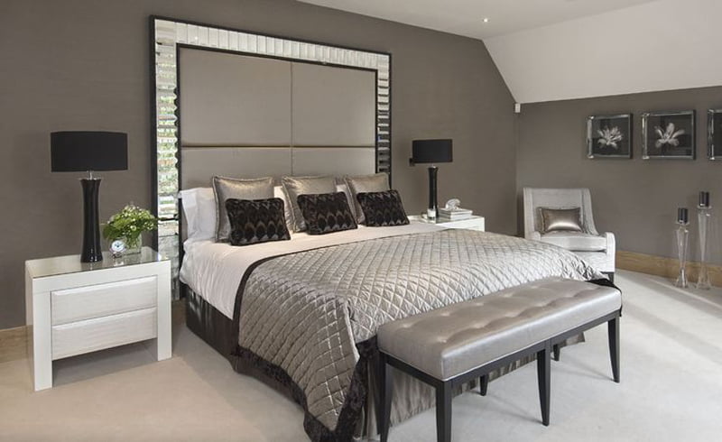 - Silver and Gray colors are main bedroom decoration elements, with using of textured fabrics and black side table night lamps.