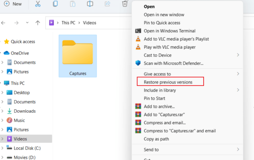 Step 2: Peform a right-click on this folder and select “Restore previous versions.”