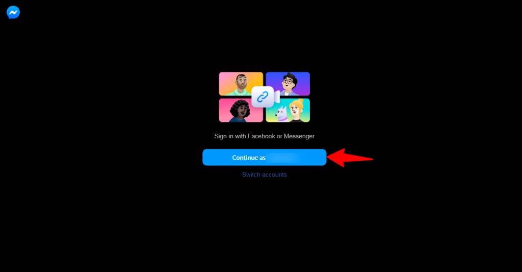 4. Use your Facebook login credentials to log into the Messenger Rooms and click on continue as.