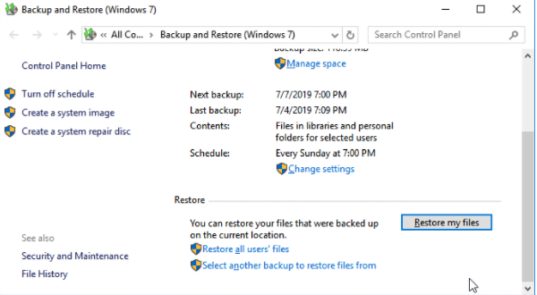2. Now go to “Backups and Restore(Windows 7)” and click on “Restore my files”