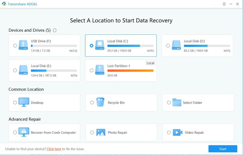 Step 1: Download 4DDiG according to your system, install it, launch the program, and attach the USB flash drive to your PC. Select a location where you lost files(here you can choose USB Drive)